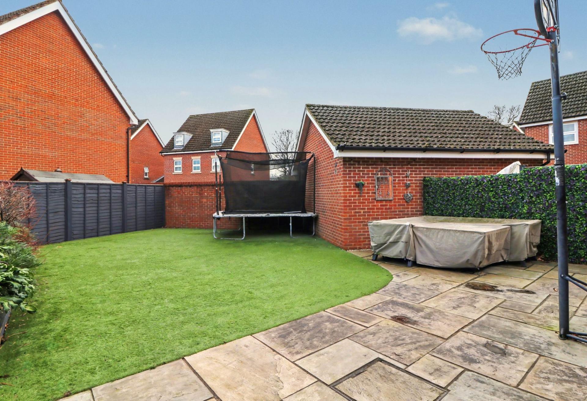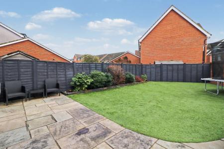 The beautiful, landscaped rear garden has a paved seating area, leaving the rest of the garden laid to artificial lawn.