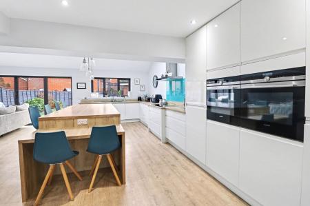 The kitchen has been fitted with a stylish range of contemporary wall and base units, with a large island incorporating a breakfast bar and integrated appliances including two ovens, an induction hob with extractor over, fridge/freezer and a dishwasher.
