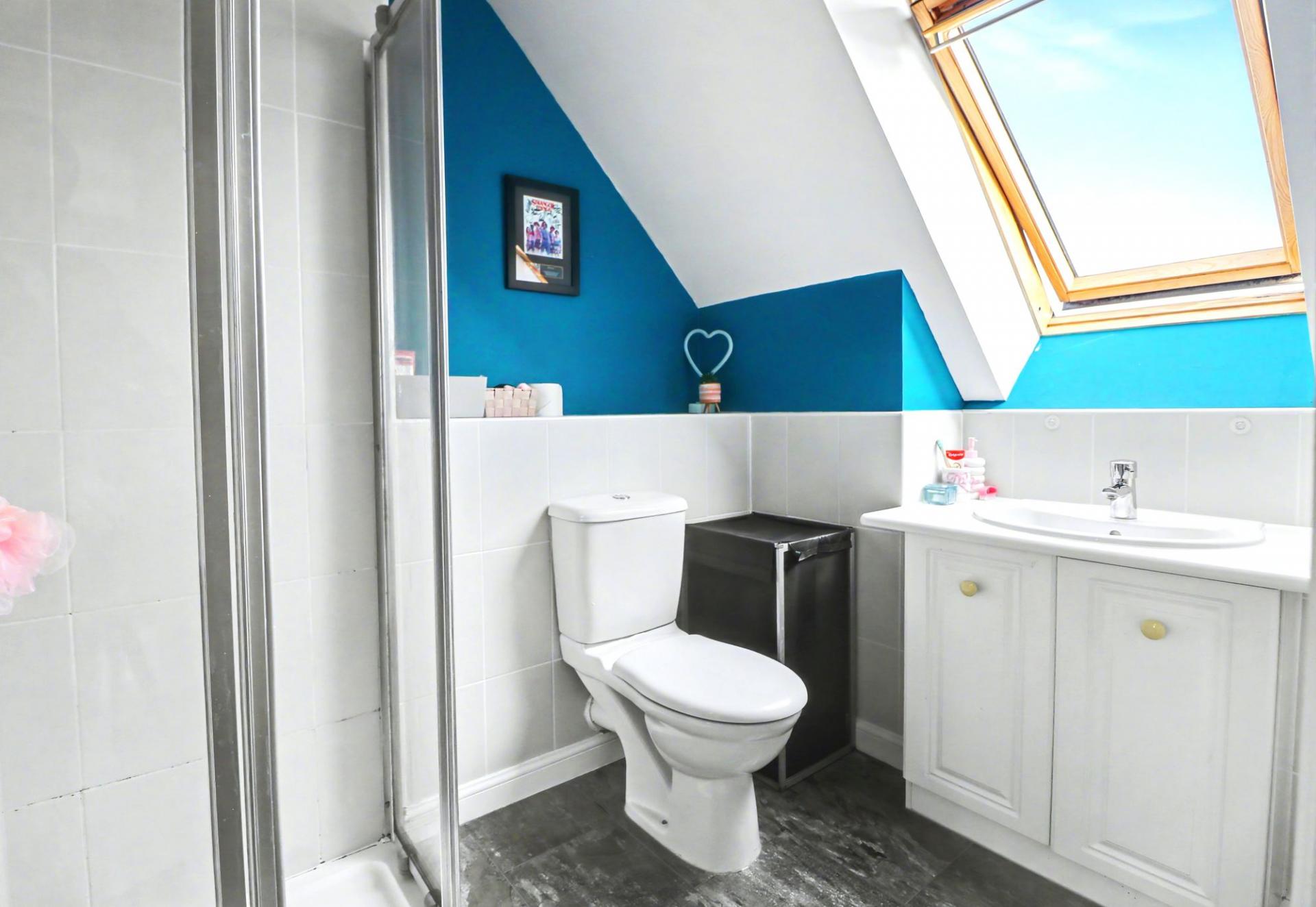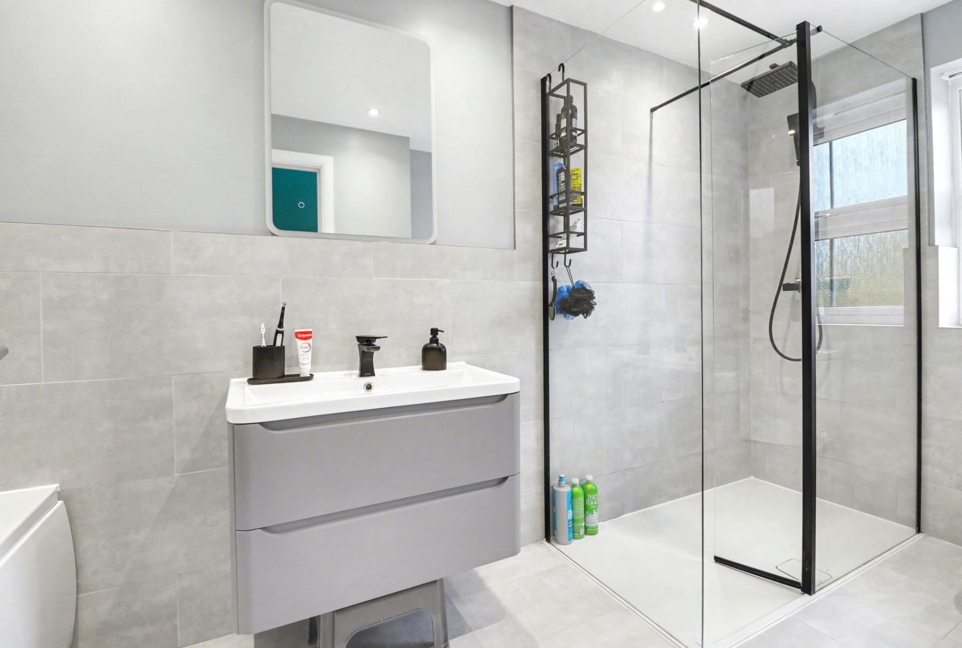 The impressive family bathroom comprises a large, walk-in shower cubicle, panel enclosed bath, vanity wash hand basin and a WC.