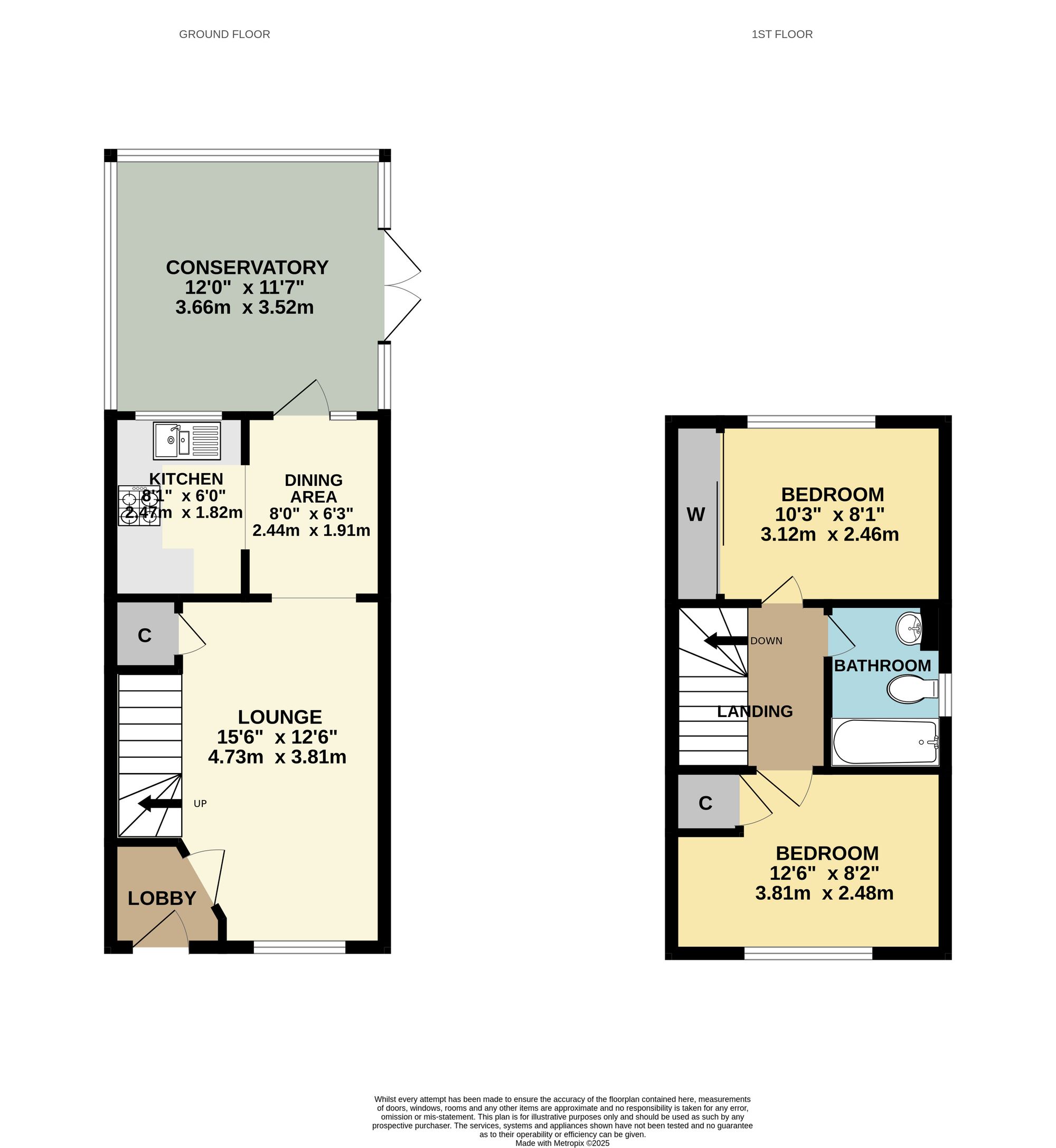 The ground floor comprises a well-proportioned lounge, fitted kitchen with adjoining dining area and a good size conservatory. On the first floor there are two double bedrooms and a family bathroom.