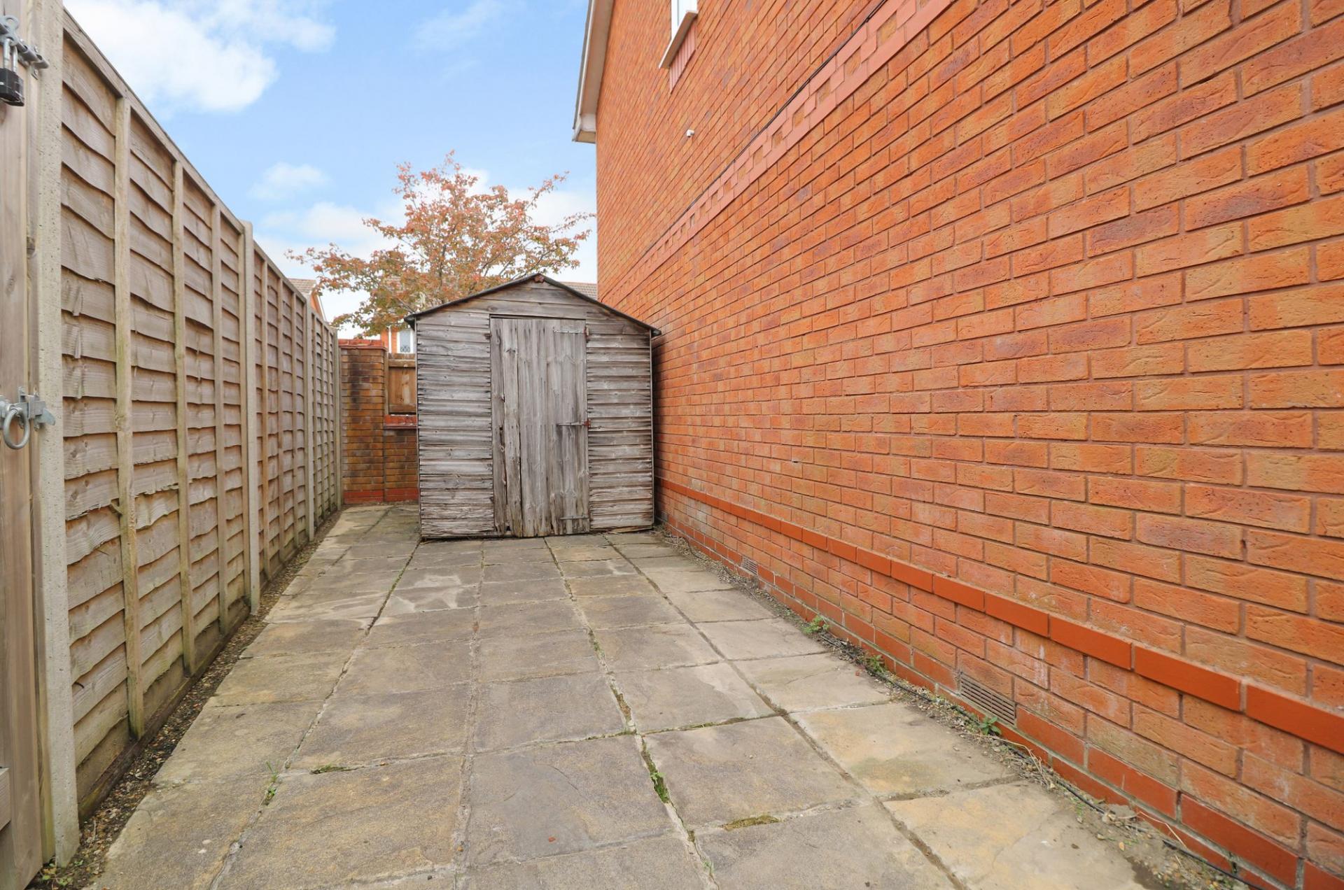 To the front there is allocated parking for two cars and gated, side access leading round to the rear garden which enjoys a south westerly aspect and has a paved patio area to the side with a storage shed, leaving the rest of the garden laid to lawn.