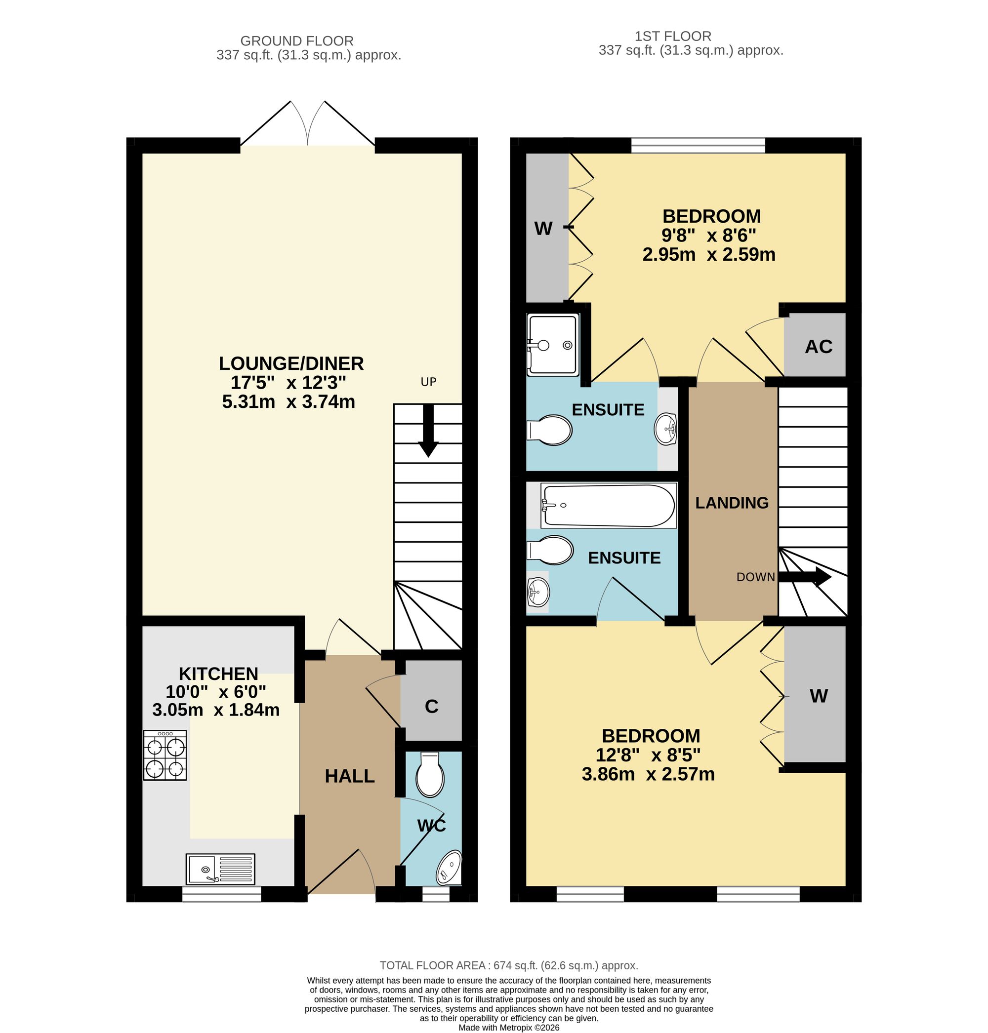 This well-presented, two bedroom terraced house comprises a modern fitted kitchen, WC and a spacious lounge/diner with French doors to the rear garden. On the first floor there are two double bedrooms, both with en-suite facilities.