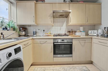 The entrance hall has a built-in storage cupboard and provides access to the modern WC and open plan kitchen, which has a window to the front and a range of wall and base units incorporating a built-in oven with gas hob and extractor over, as well as space for a fridge/freezer and washing machine.