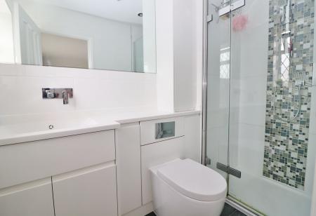 On the first floor, the good size master bedroom faces the front, has built-in wardrobes and a modern en-suite with a shower cubicle, vanity wash hand basin, WC and a window to the front.
