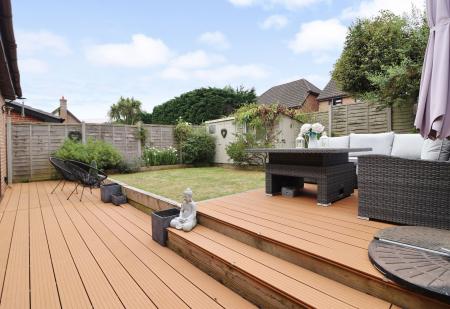 The rear garden enjoys a south westerly aspect and has a decked seating area, leaving the remainder of the garden laid to lawn with attractive, flower and shrub borders and a shed to one corner.