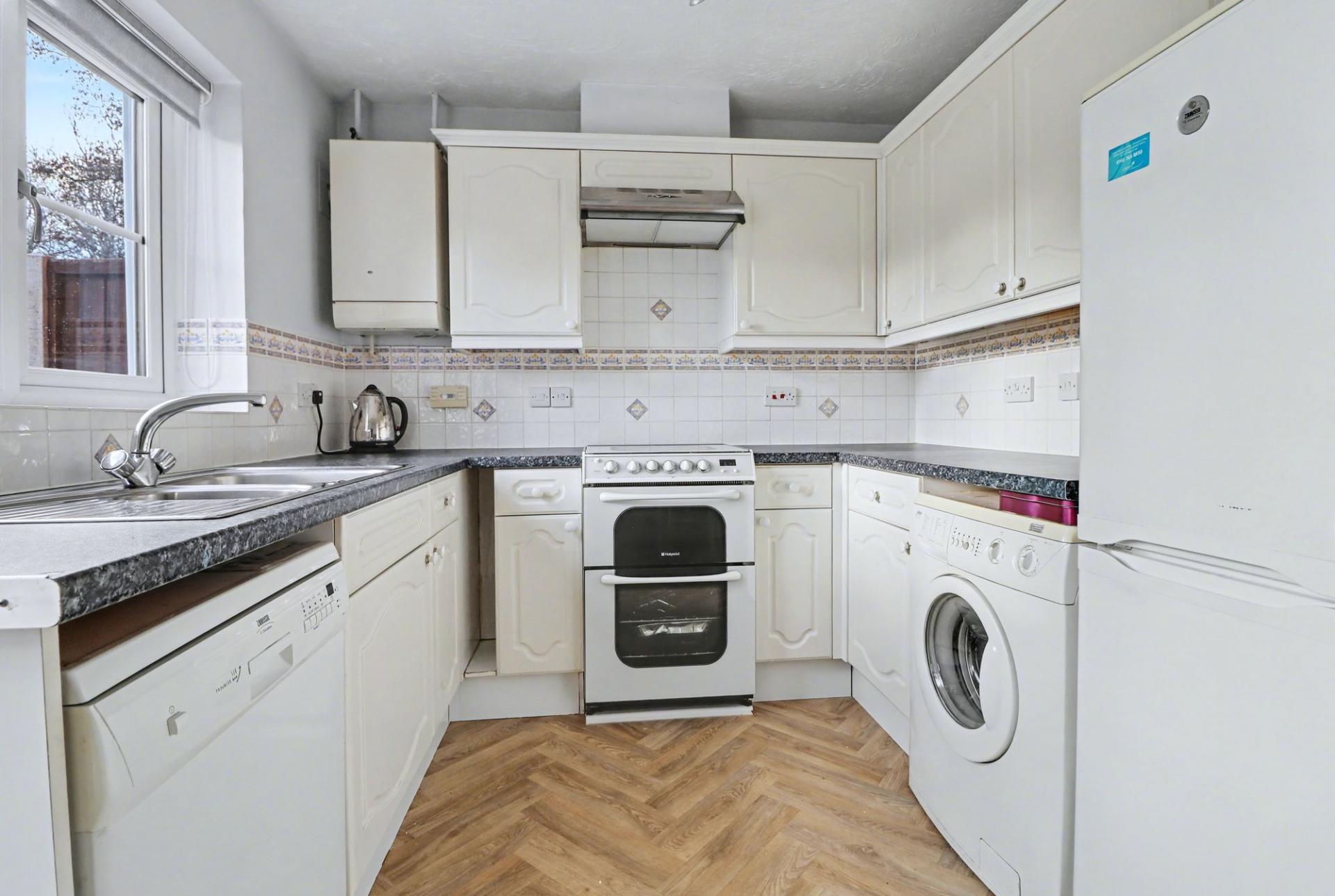 The kitchen has been fitted with a range of wall and base units with free-standing appliances including a cooker, fridge/freezer, dishwasher and washing machine (all included).
