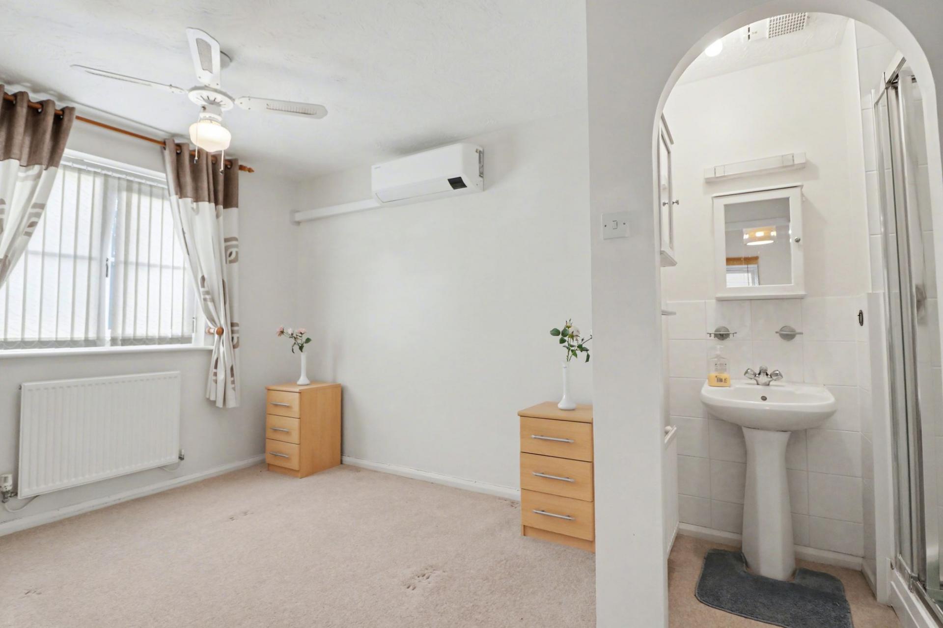 The master bedroom overlooks the rear garden, has a fitted wardrobe, a wall mounted air conditioning unit and an en-suite with a shower cubicle and wash hand basin. Bedroom two faces the front of the property, whilst the third bedroom has a window to the rear.