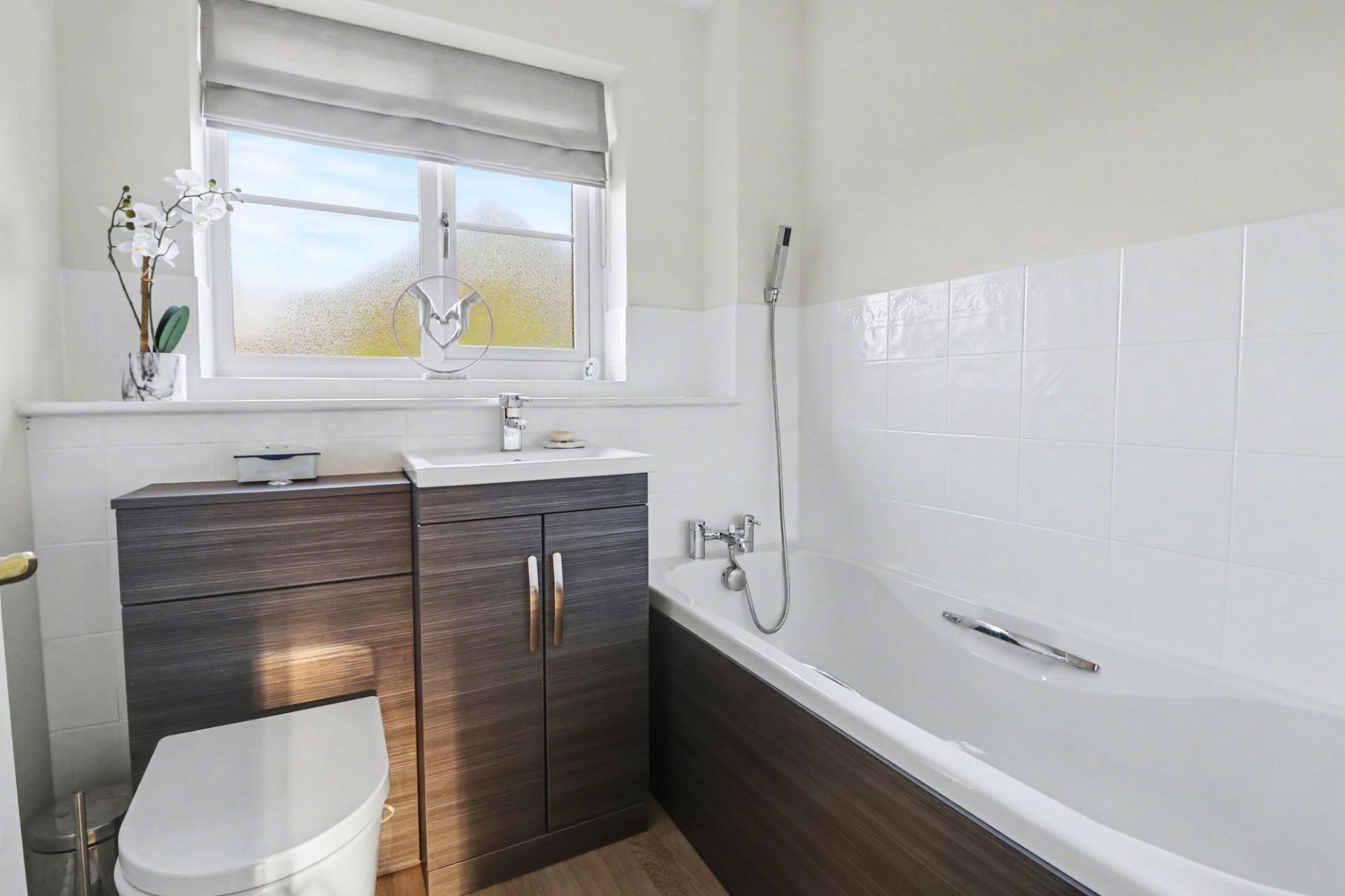 The stylish family bathroom has been fitted with a contemporary suite comprising a panel enclosed bath with handheld shower attachment, vanity wash hand basin, WC and a window to the rear.