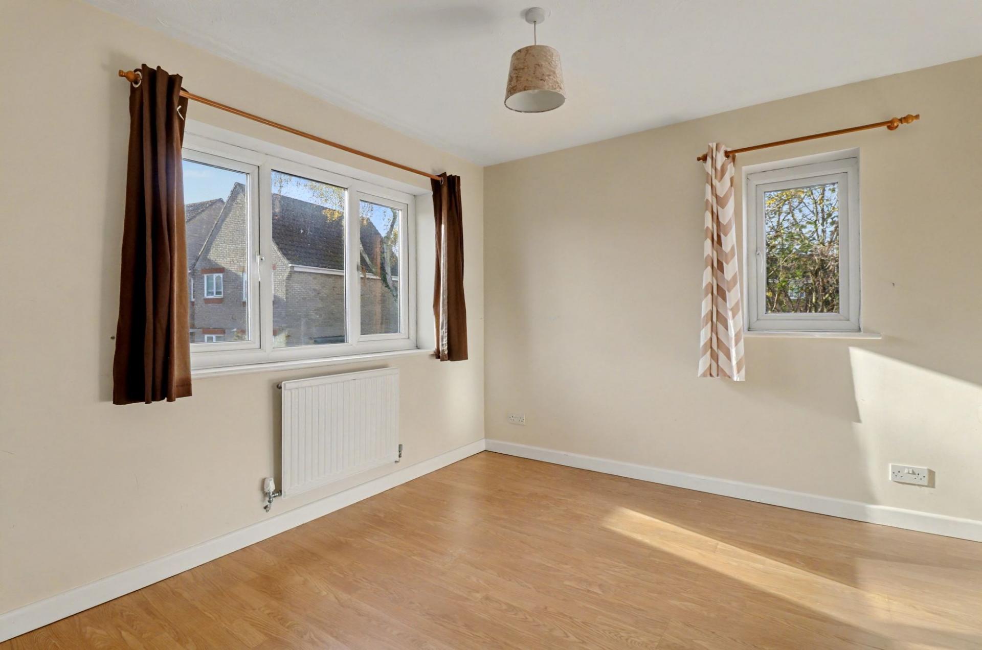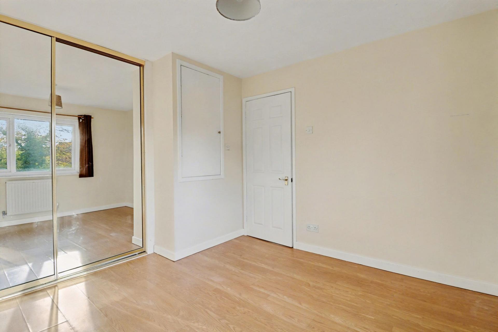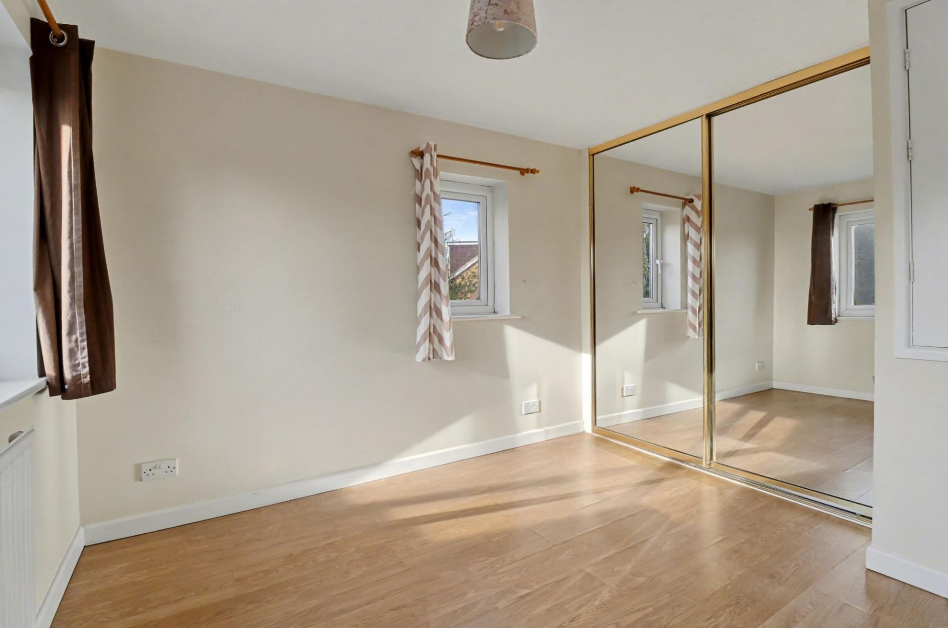 The well-proportioned, double bedroom enjoys a dual aspect and has a fitted wardrobe with mirrored, sliding doors, as well as a storage cupboard above the stairs.
