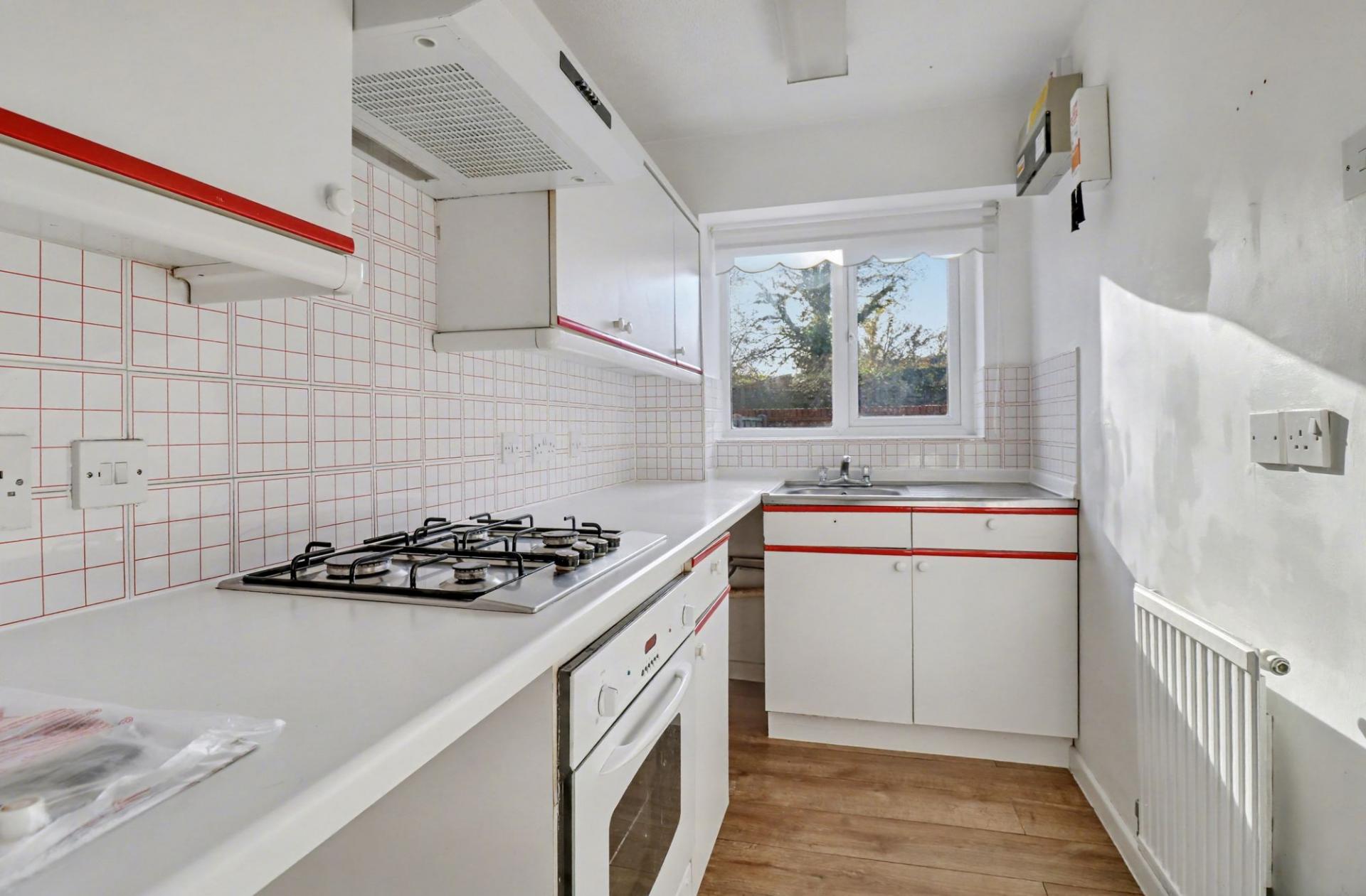 The kitchen also faces the rear of the property and has been fitted with a range of wall and base units with a stainless steel sink, built-in oven and gas hob with extractor over, space for further appliances and a large storage cupboard.