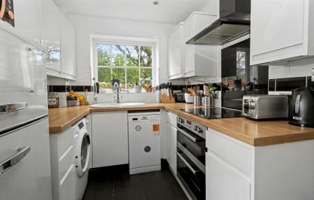 The modern kitchen has been fitted with a range of wall and base units with a built-in oven and hob with extractor over and appliance space for a free-standing fridge/freezer, slimline dishwasher and washing machine. There is also a window to the rear, a large understairs storage cupboard and a door leading out to the side garden.