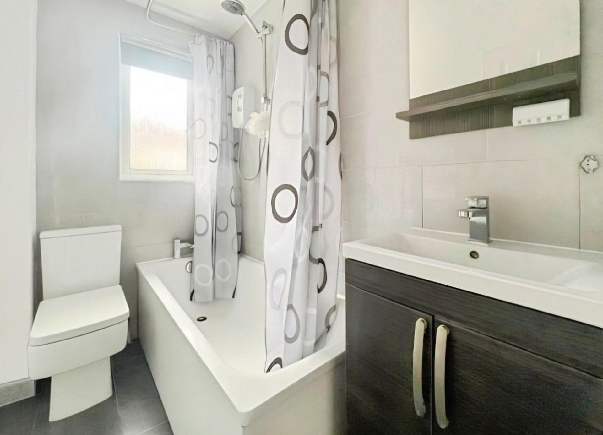 The modern bathroom comprises a panel enclosed bath with electric shower over, vanity wash hand basin, WC and a window to the rear.