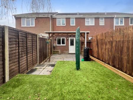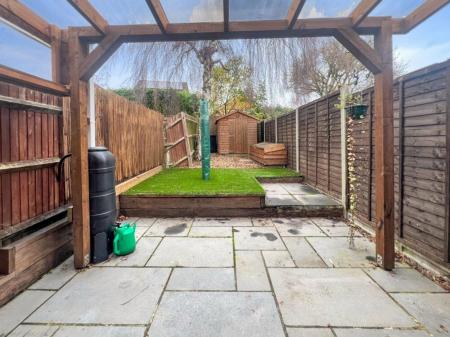 To the front there is driveway parking for one car and an allocated parking space. The enclosed rear garden has a paved patio area with pergola over, leaving the rest of the garden mainly laid to artificial lawn with a storage shed at the end.