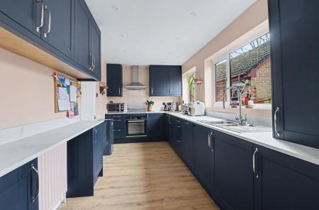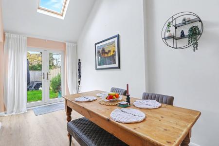 The kitchen has been fitted with a contemporary range of wall and base units with a built-in oven and hob with extractor over, as well as an integrated fridge and dishwasher. The dining area sits open plan to the kitchen in an extension featuring a vaulted ceiling with Velux window and French doors leading out to the rear garden.