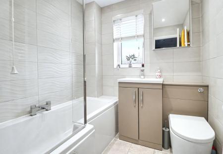 The stylish family bathroom comprises an ‘L’ shaped bath with shower and glass screen over, vanity wash hand basin, heated towel rail, WC and a window to the front.