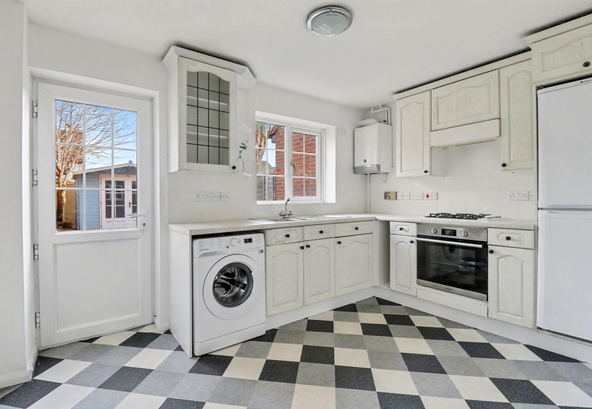The kitchen/diner has been fitted with a range of wall and base units with a built-in oven and gas hob with extractor over and appliance space for a fridge/freezer and washing machine. There is also a window to the rear and a door leading out to the garden.