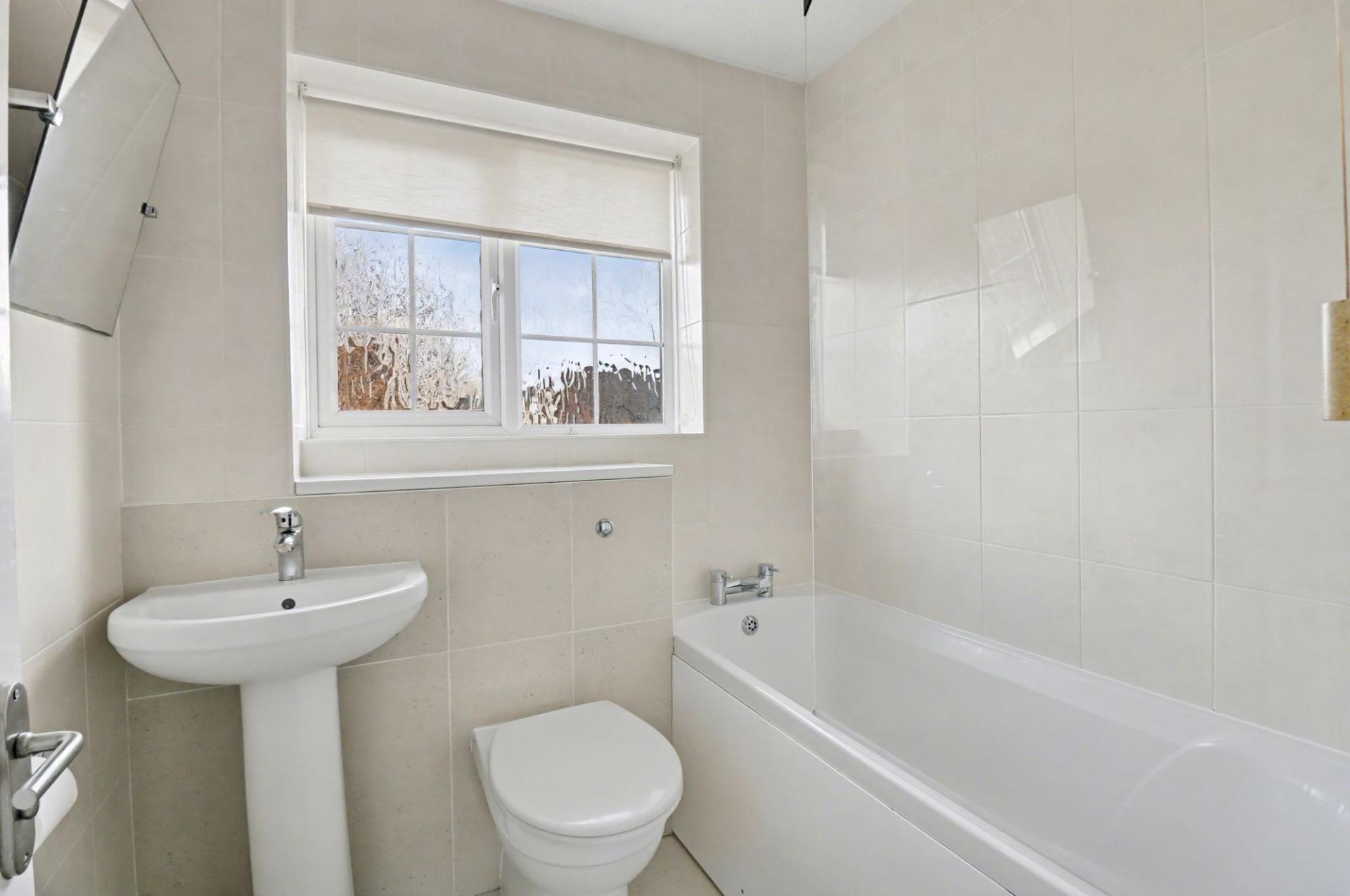 The modern bathroom comprises a panel enclosed bath with shower and screen over, wash hand basin, WC, complementary tiling and a window to the rear.