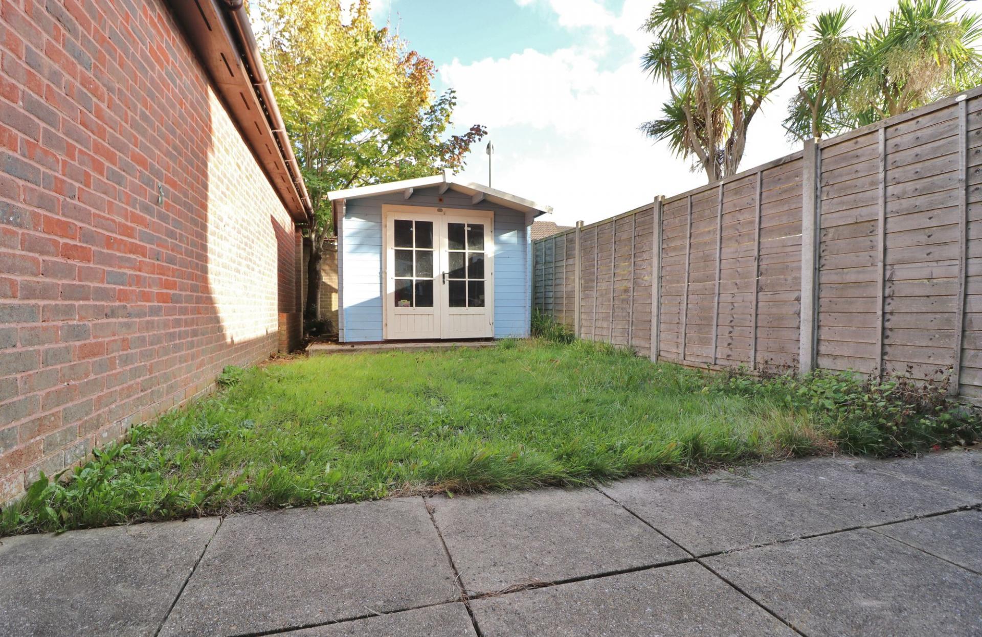 Gated side access leads round to the rear garden, which enjoys a south easterly aspect and has a paved seating area, leaving the rest of the garden laid to lawn with a summer house at the end.