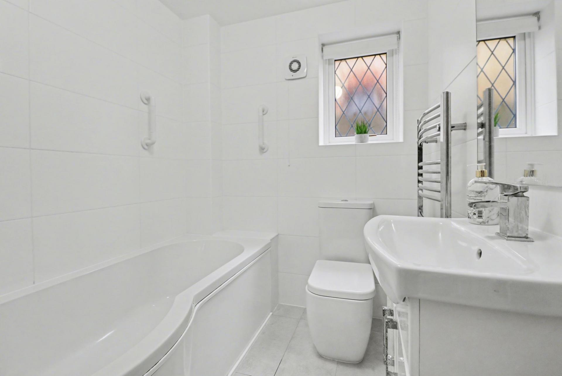The modern bathroom comprises a P-shaped bath, vanity wash hand basin, WC, heated towel rail and a window to the side.