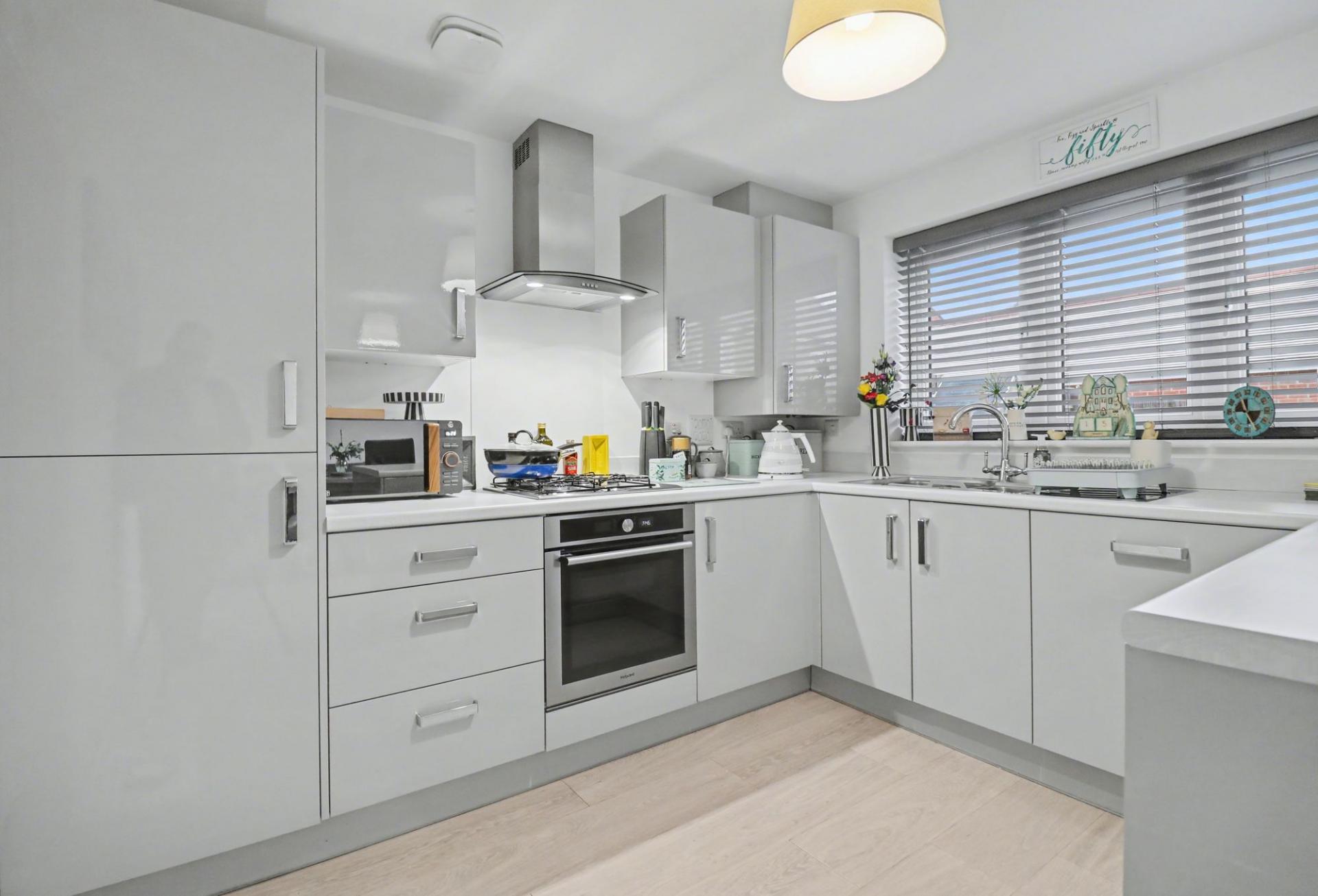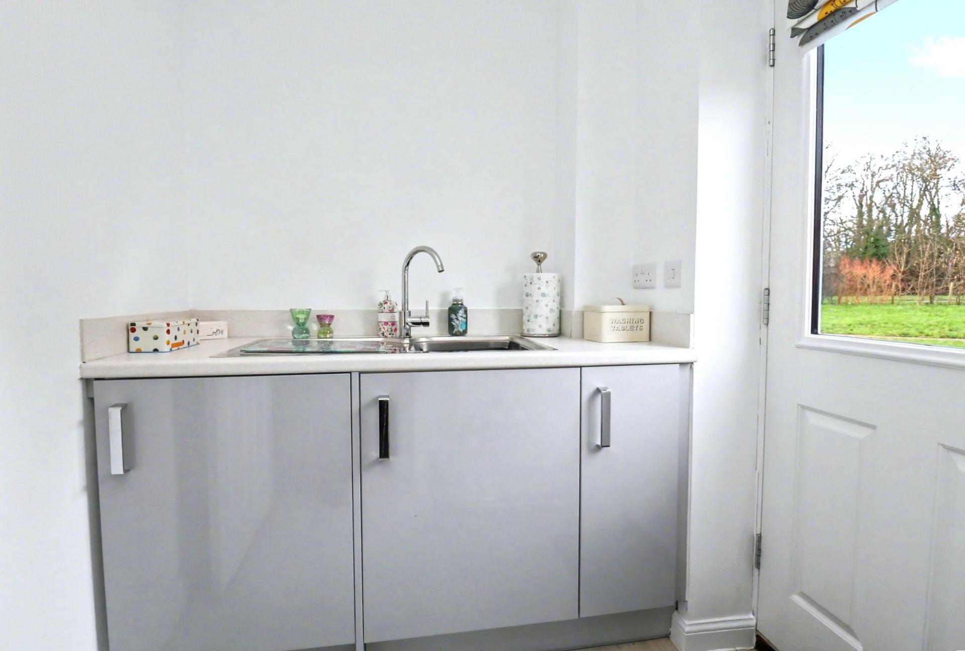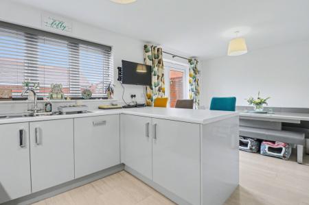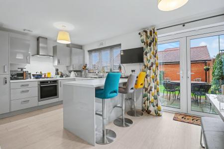 The beautifully presented kitchen/diner has French doors opening out to the rear garden and has been fitted with a stylish, contemporary range of units with a built-in oven and gas hob with extractor over, as well as an integrated fridge/freezer and dishwasher. The adjoining utility room has a door to side and offers further units with space for a washing machine.