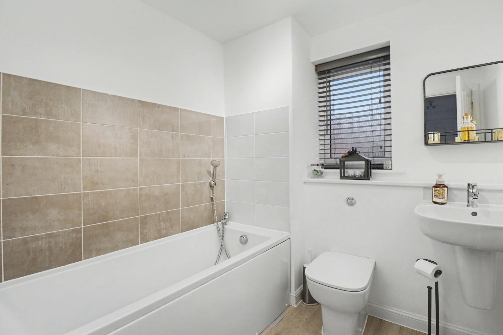 The modern family bathroom has a panel enclosed bath, wash hand basin, WC and a window to the front.