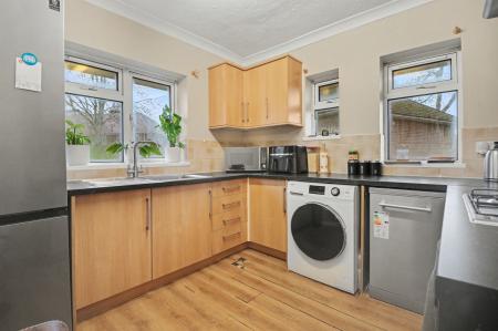 The kitchen enjoys a dual aspect with windows to the side and rear and has been fitted with a matching range of wall and base units with a built-in oven and gas hob with extractor over, as well as appliance space for a free-standing fridge/freezer, dishwasher and washing machine.