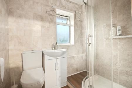 The modern shower room comprises a shower cubicle, vanity wash hand basin, WC and a window to the rear.
