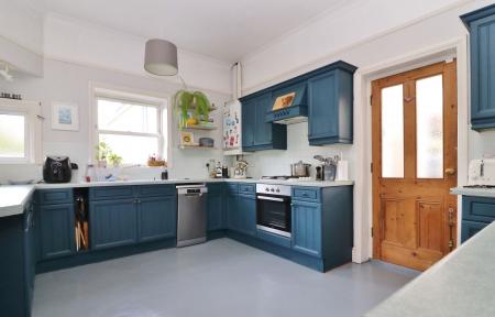 The kitchen has windows to the side and rear and has been fitted with a range of wall and base units with a built-in oven and gas hob with extractor over and an integrated dishwasher. A door to the side leads through to the utility room which has windows to the side, space for appliances and a window and door leading outside.