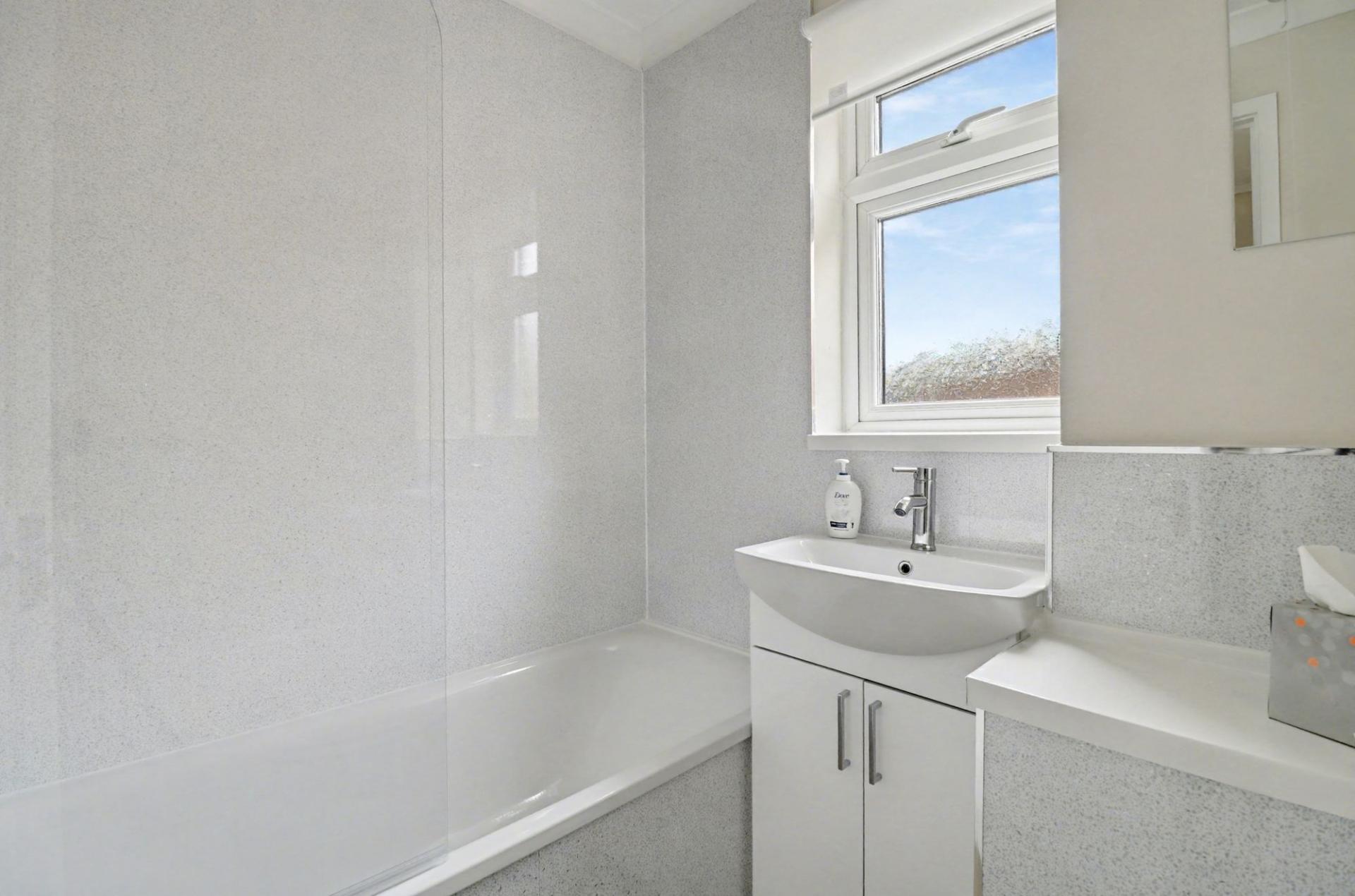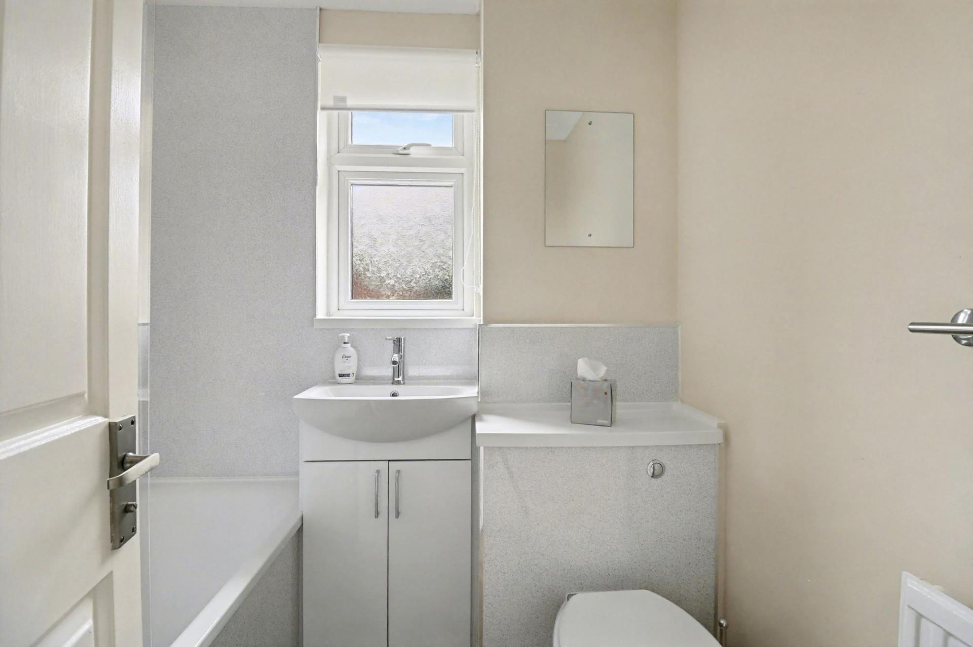 The modern family bathroom comprises a panel enclosed bath with shower and screen over, vanity wash hand basin, WC and a window to the side.