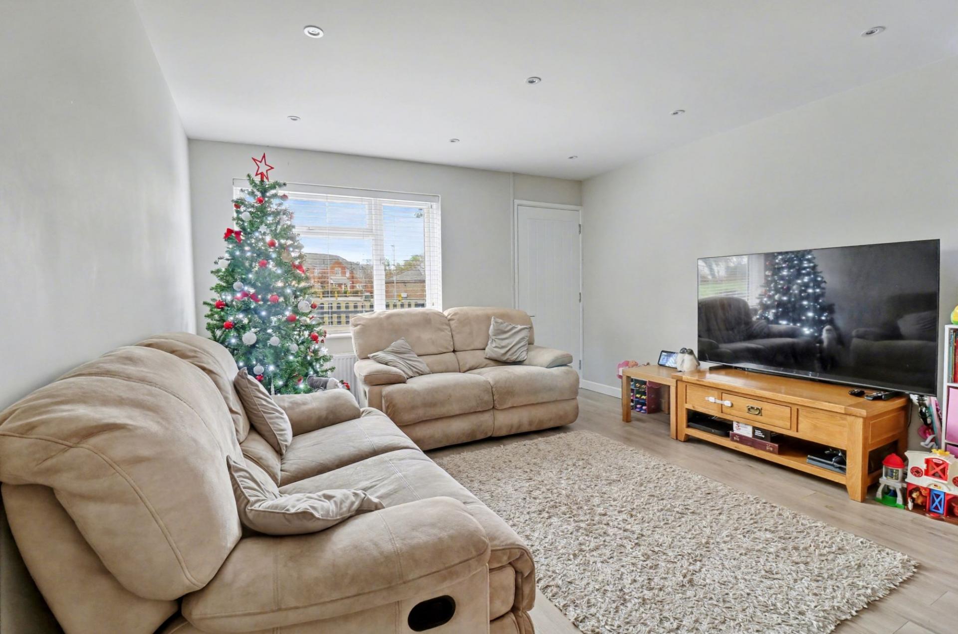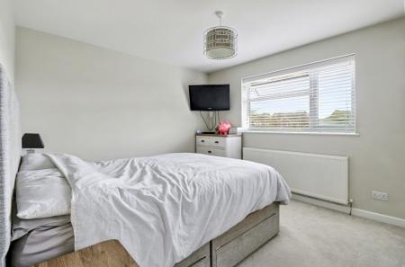 The good-sized master bedroom overlooks the green to the front, whilst the second bedroom has a built-in in cupboard and a window to the rear.