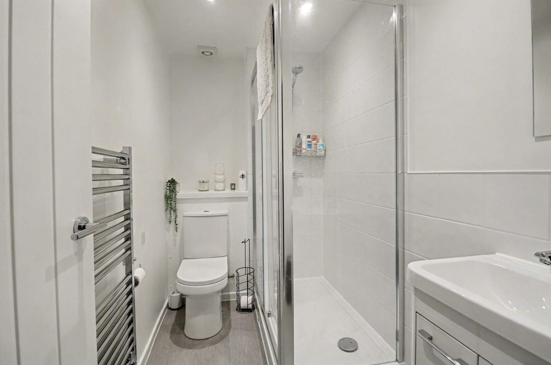 The modern shower room has been fitted with a vanity wash hand basin, WC, shower cubicle and a heated towel rail.