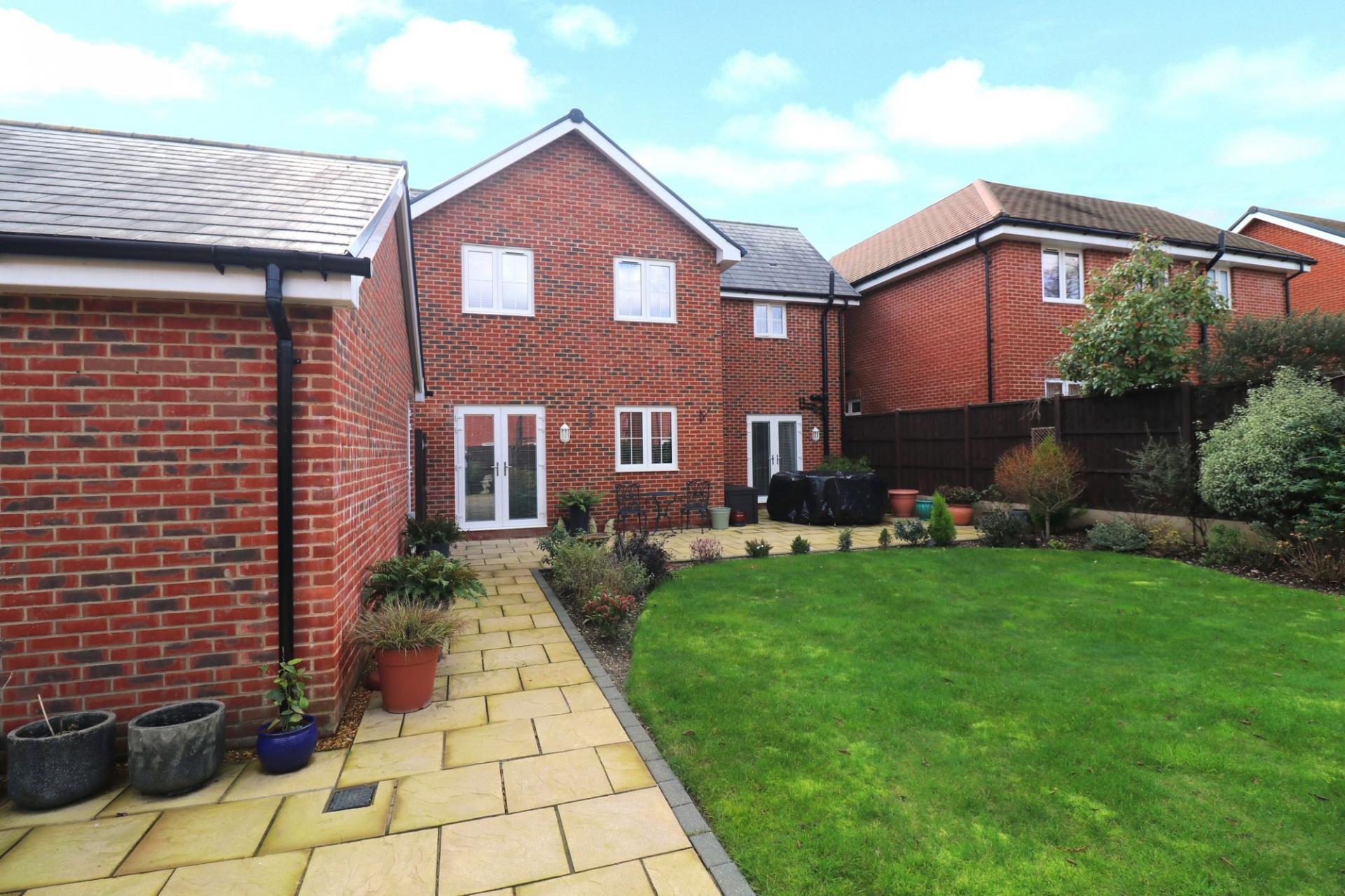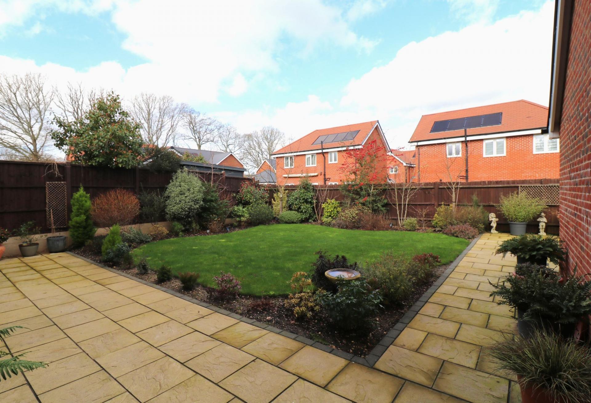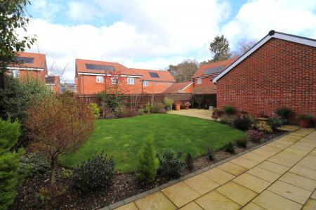 To the side there is a large driveway providing parking for approximately four to six vehicles and leads to the detached garage. Side access via a gate leads through to the rear garden which is of a generous size and is predominantly laid to lawn with established borders. Two patio areas offer excellent space for outdoor dining and entertaining.