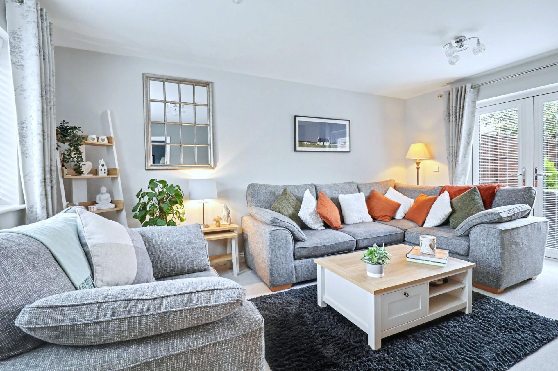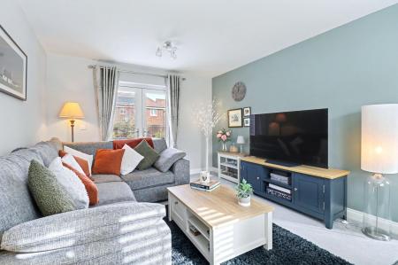 The front door opens into a generous entrance hall, creating a welcoming first impression, with stairs rising to the first floor and a useful storage cupboard. The lounge is a bright and airy room, enhanced by French doors opening out to the rear garden, allowing plenty of natural light and seamless indoor-outdoor living.