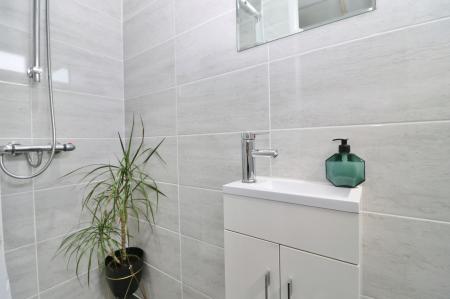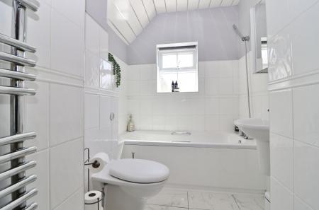 The family bathroom has been fitted with a modern suite including a panel enclosed bath with shower attachment over.