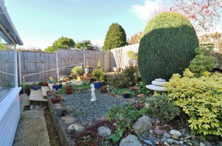 The attractive rear garden has been landscaped with a paved patio and a decked seating area, with a variety of planting and a storage shed to one side.