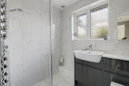 The modern shower room comprises a vanity wash hand basin, walk-in shower cubicle, WC, heated towel rail and a window to the rear.