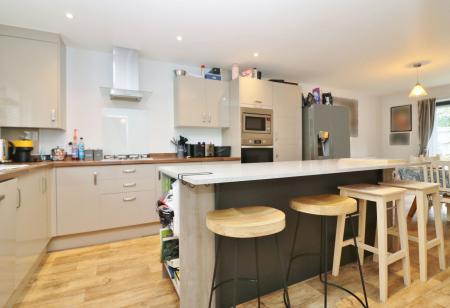 The impressive kitchen/diner is a good-sized room with a window to the front and French doors from the dining area opening out to the rear garden. The kitchen has been fitted with a modern range of wall and base units with a central island incorporating a breakfast bar. There is a built-in oven and microwave, gas hob with extractor over, an integrated dishwasher, as well as space for a fridge/freezer and washing machine.
