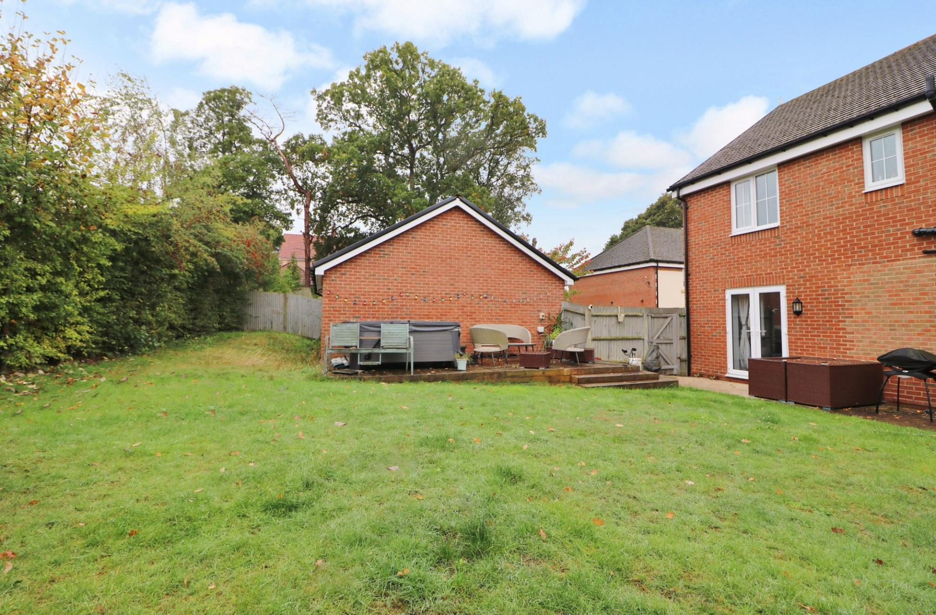 To the side there is driveway parking leading to the detached double garage. Gated side access leads round to the attractive rear garden which has a paved patio and decked seating area to one side, leaving the rest of the garden mainly laid to lawn with hedge borders and wrapping behind the garage.