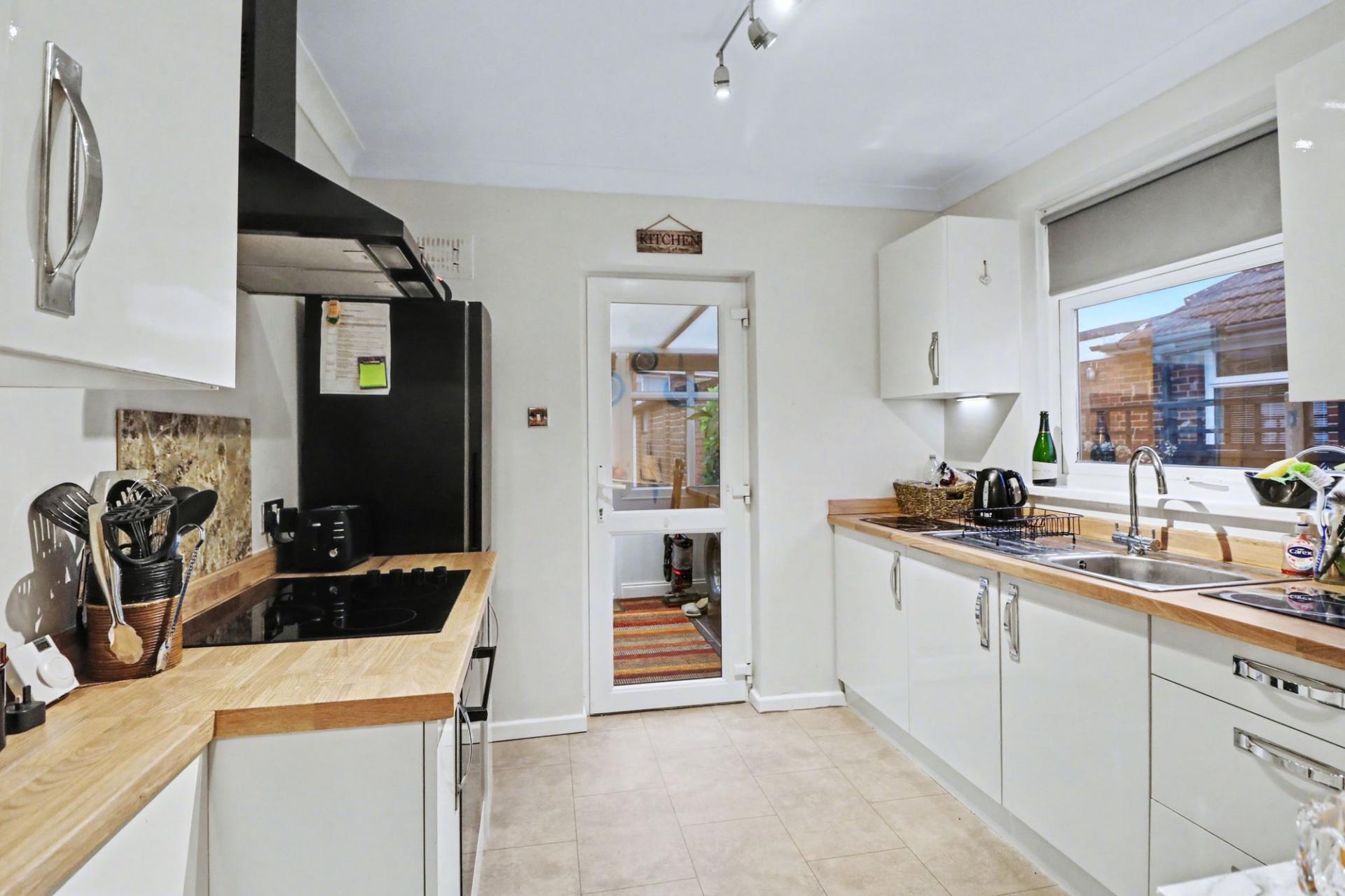 The modern kitchen has a window to the side and has been fitted with a modern range of wall and base units with a built-in oven and hob with extractor over and appliance space for a free-standing fridge/freezer.