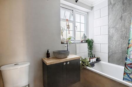 The modern family bathroom comprises a panel enclosed bath with shower over, vanity wash hand basin, WC and a window to the rear.