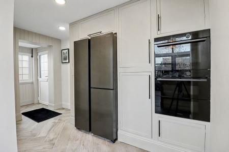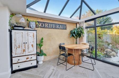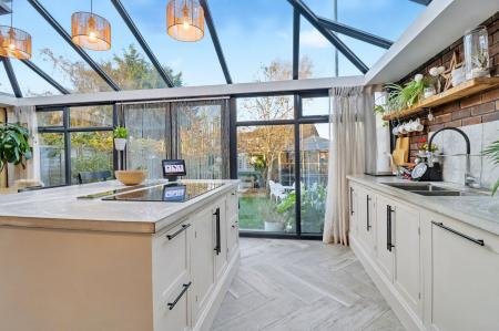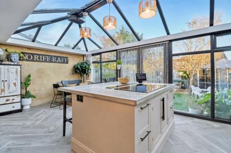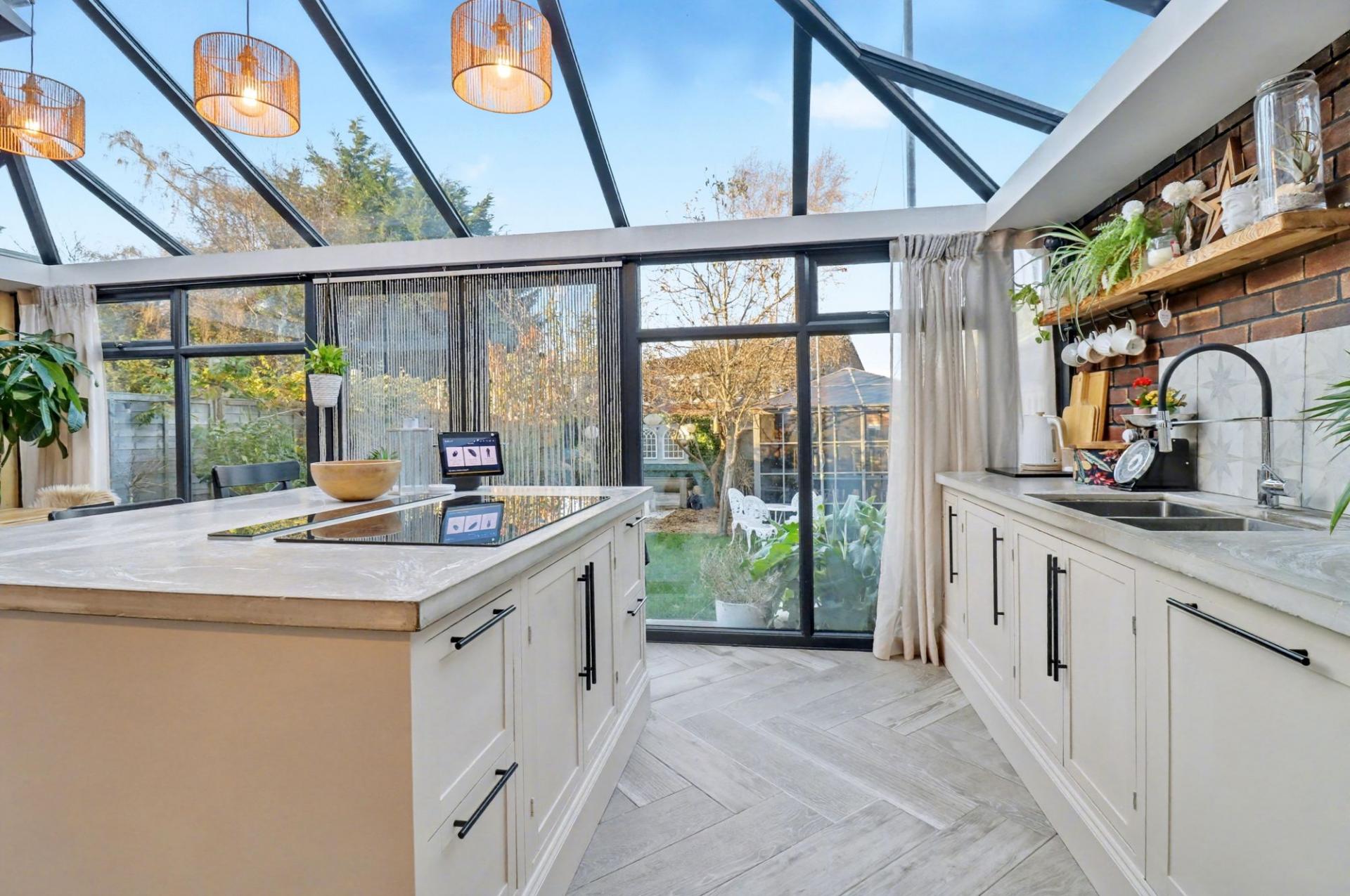 An opening then leads through to the wonderful kitchen/diner which enjoys a vaulted glass ceiling and French doors leading out to the rear garden. The kitchen has been fitted with a beautiful range of shaker style wall and base units, including a central island incorporating a breakfast bar and induction hob. There is an integrated dishwasher and the kitchen extends round to the side where there are further fitted units, a built-in double oven and space for an American style fridge/freezer.