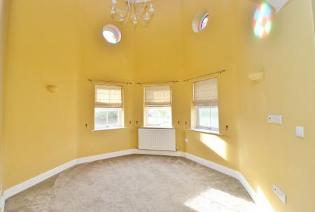 An opening from the dining area leads through to the impressive lounge which has windows to the front aspect, a vaulted ceiling and two, attractive stained glass windows.
