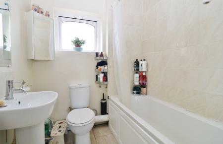 The family bathroom comprises a panel enclosed bath with shower over, wash hand basin, WC and a window to the front.