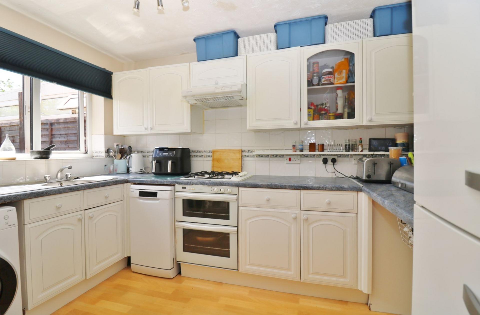 The kitchen has been fitted with a range of wall and base units with a built-in double oven and gas hob with extractor over, space for free-standing appliances and a window to the rear.