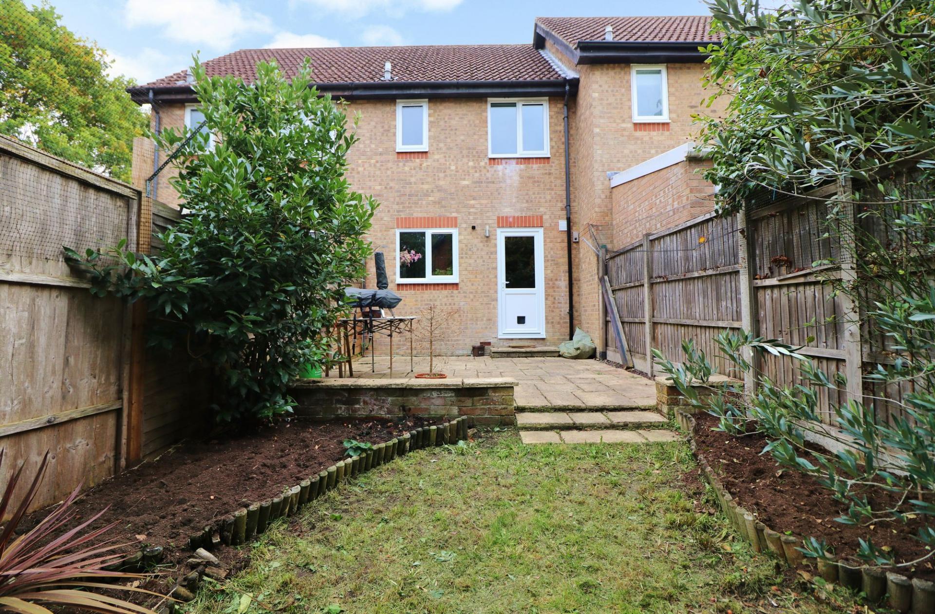 The enclosed rear garden has a paved seating area and a section of lawn with planted borders and a storage shed at the end.