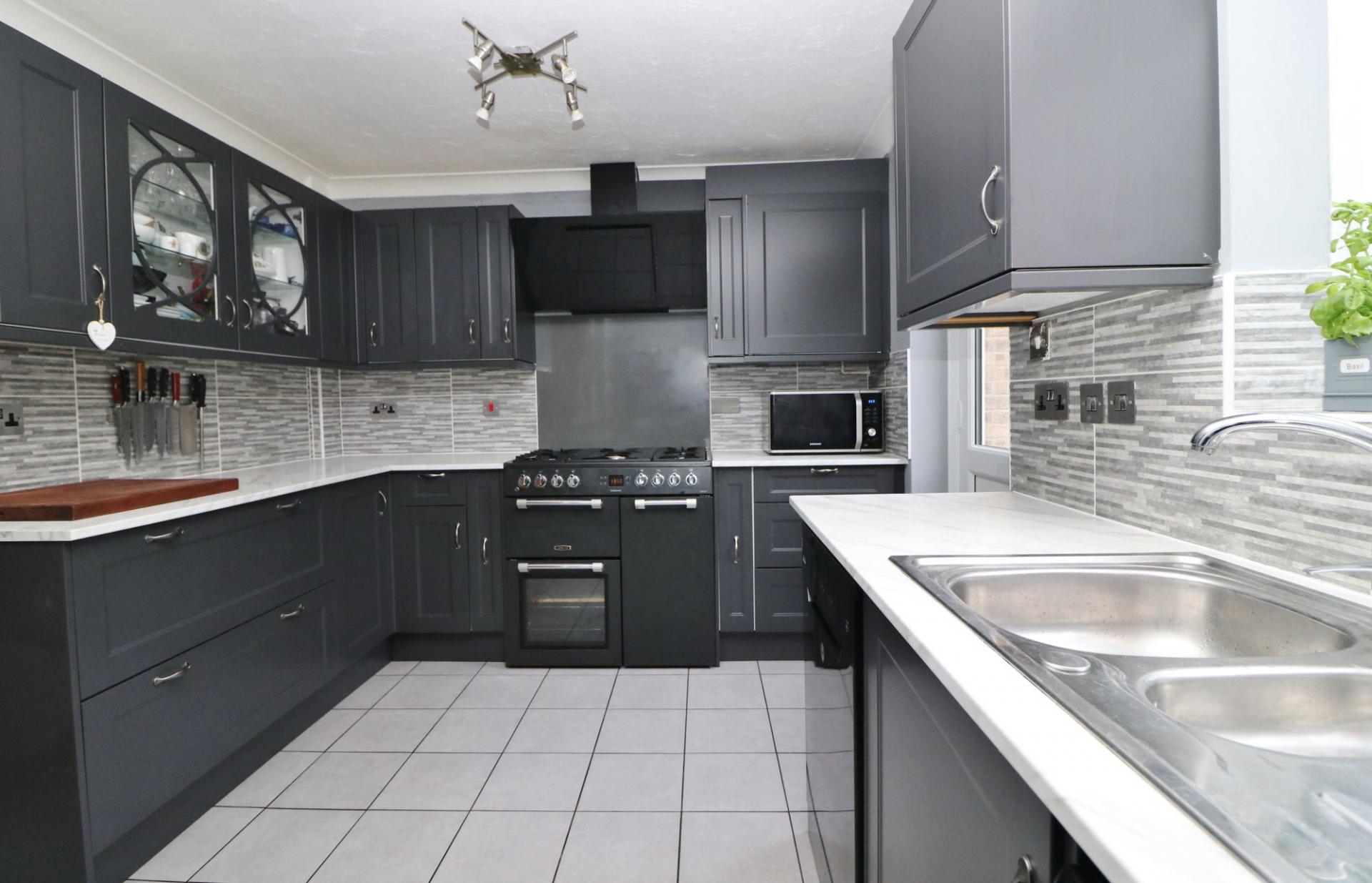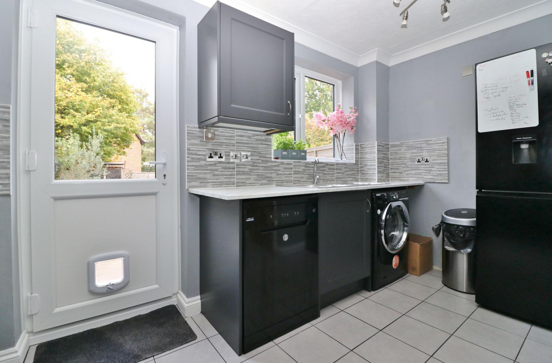 The modern kitchen has a built-in cupboard, a window and door leading out to the rear garden and has been fitted with a range of wall and base units with a Range style cooker (included) and space for a free-standing fridge/freezer, dishwasher and washing machine.