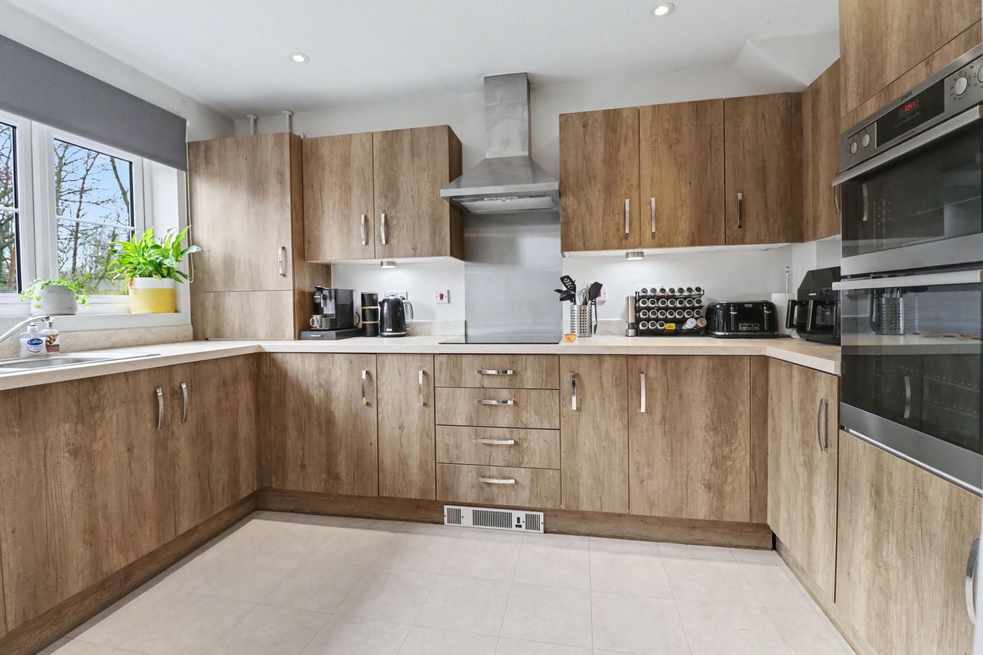 The kitchen faces the front of the property and has been fitted with a stylish range of wall and base units with a built-in double oven and induction hob with extractor over, as well as an integrated fridge/freezer and dishwasher and space for a washing machine.