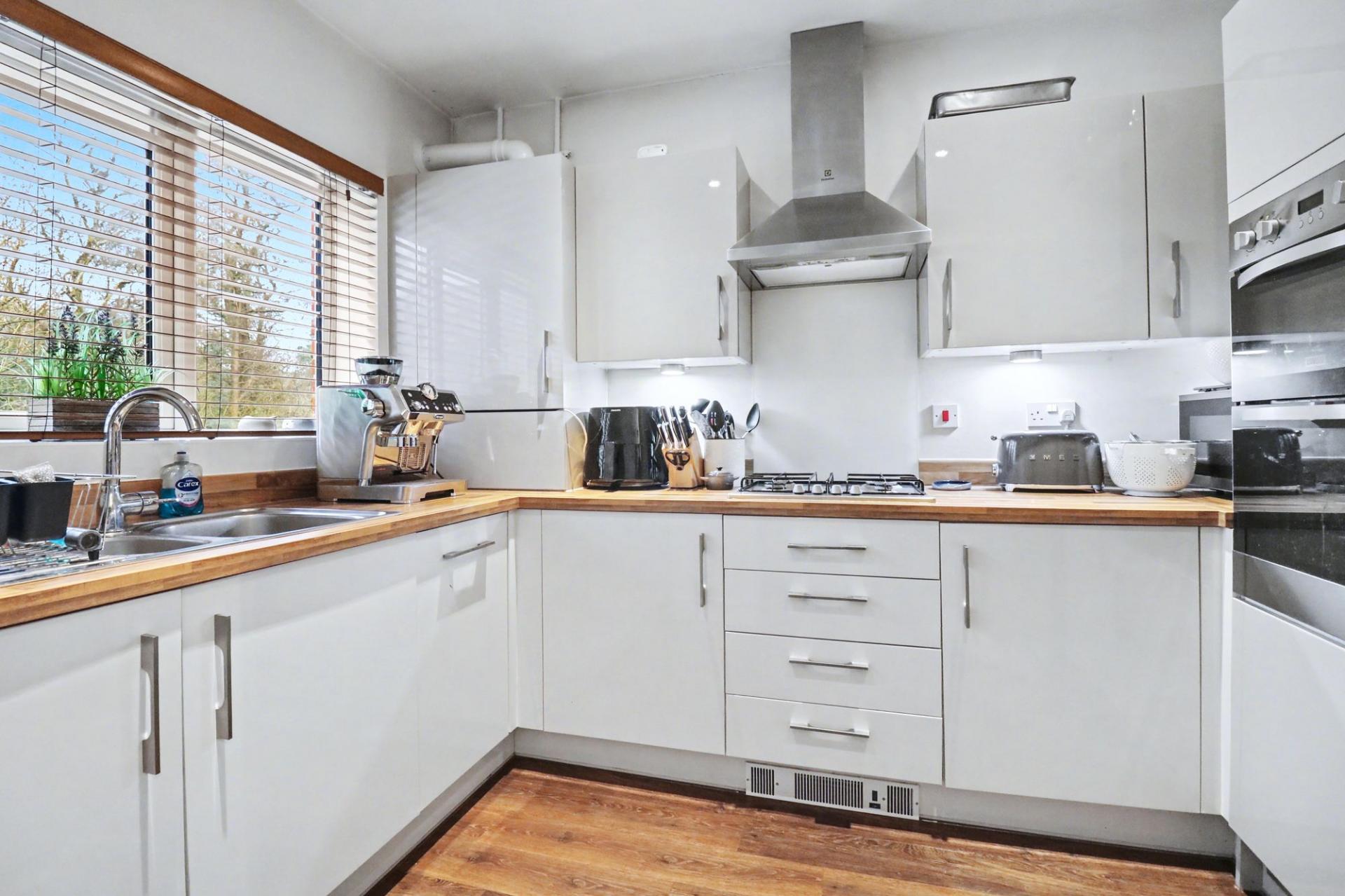 The modern kitchen has a window to the front and has been fitted with a range of high gloss units. There is a built-in double oven, gas hob with extractor over and integrated appliances including a fridge, freezer, dishwasher and washing machine.