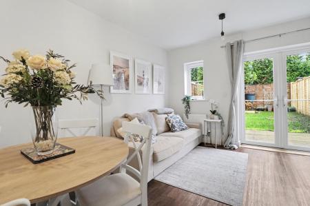 The spacious and beautifully presented lounge/diner has a built-in cupboard and a window and French doors to the rear leading out to the garden.
