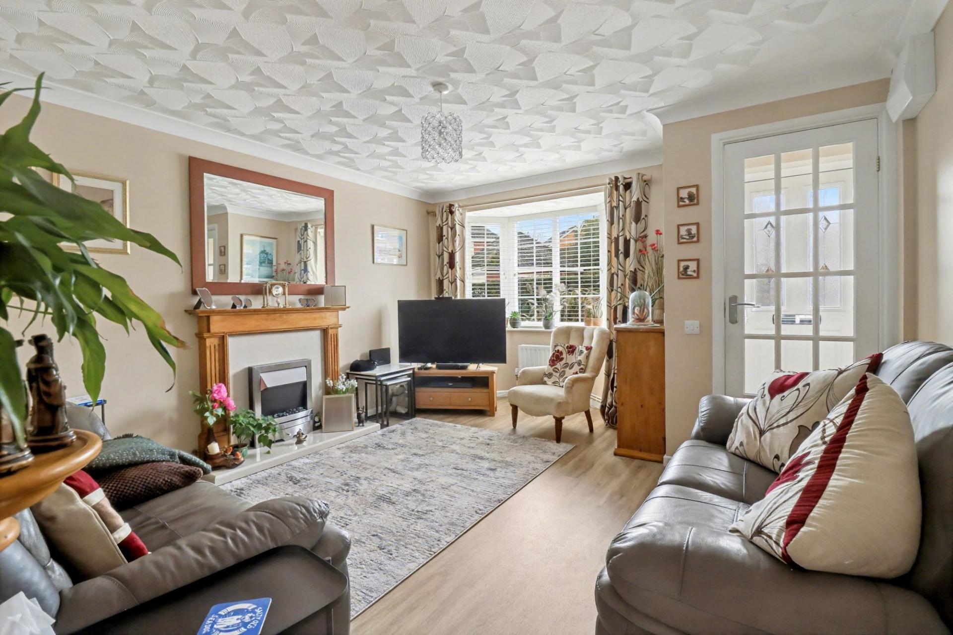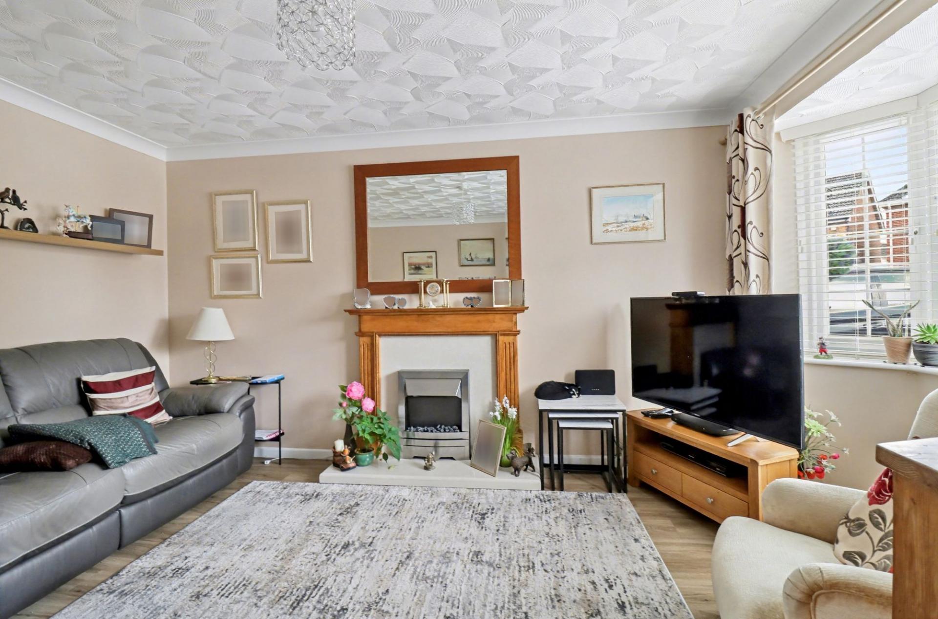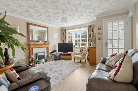 The entrance hall leads through to the spacious lounge which has a bay window to the front and a feature fireplace.